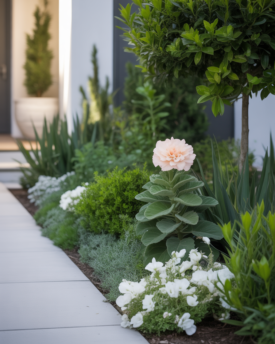 This is a great idea if you want modern front yard landscaping that feels calm rather than busy. I usually suggest mixing white blooms with evergreen shrubs and subtle textures so the space stays interesting even when flowers fade.