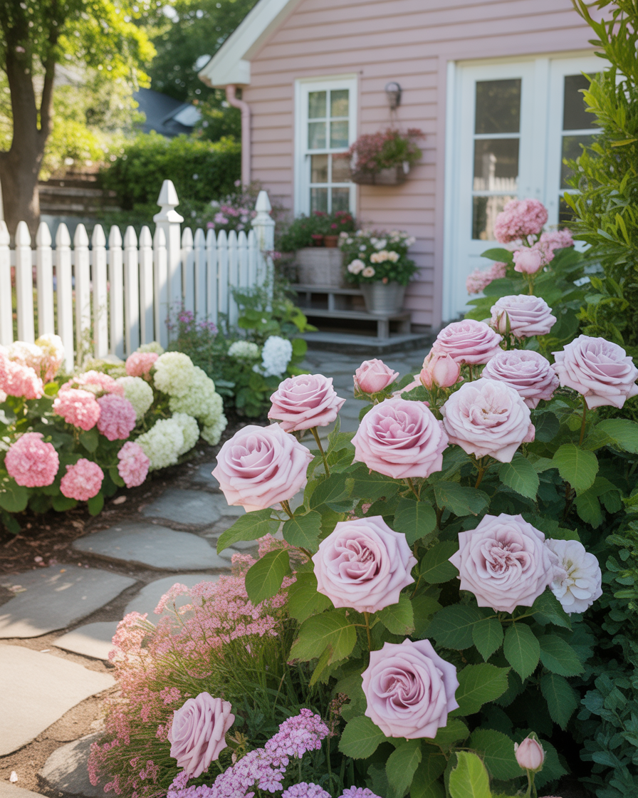 A pink cottage-style front yard always feels warm and welcoming to me. Blush roses, pink hydrangeas, and soft pastel perennials create a relaxed, storybook look that draws the eye without overwhelming the space.