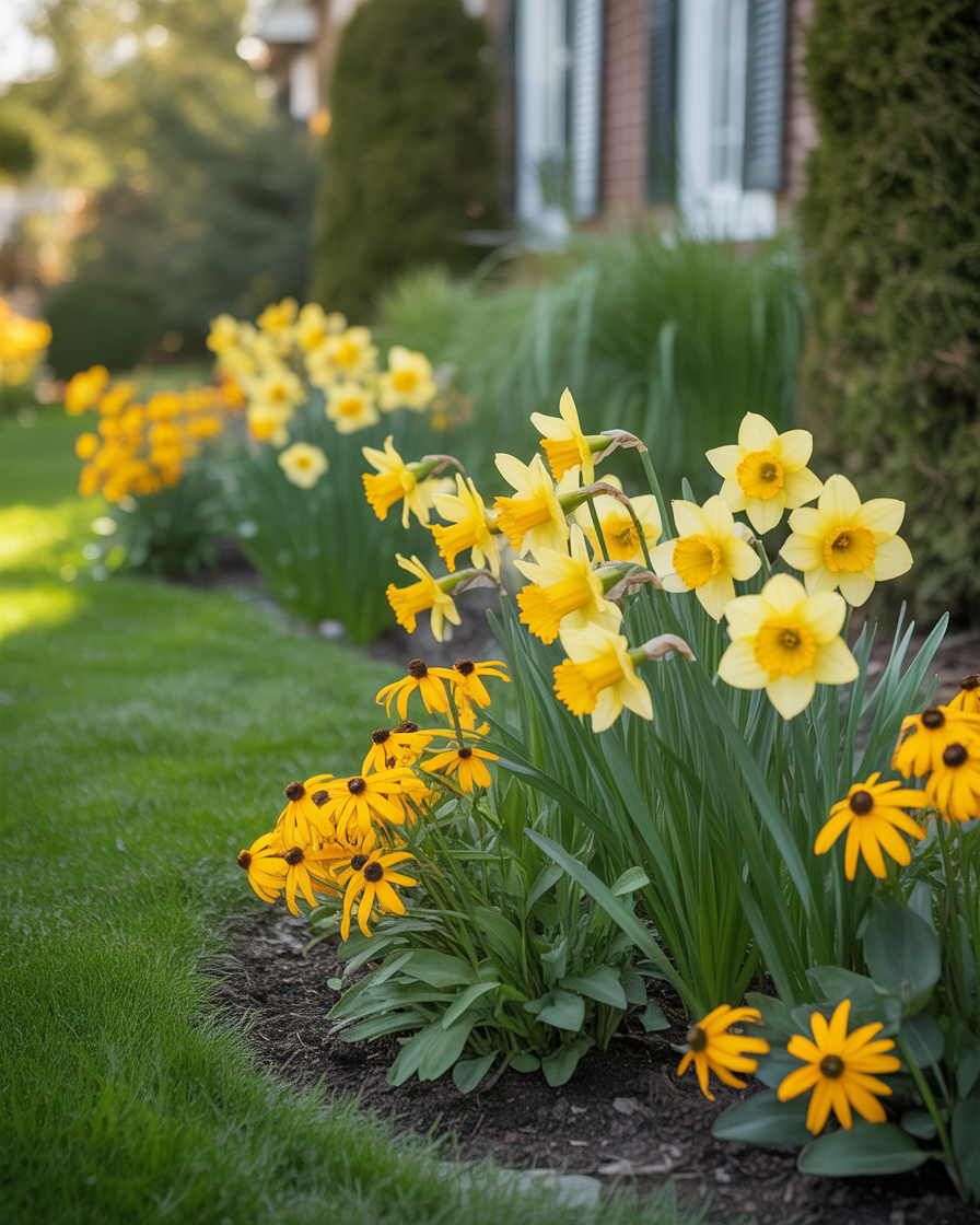 Yellow is unbeatable if you want a front yard that feels happy and full of life. Yellow front yard landscaping ideas instantly catch attention and brighten the street, especially in spring and summer.