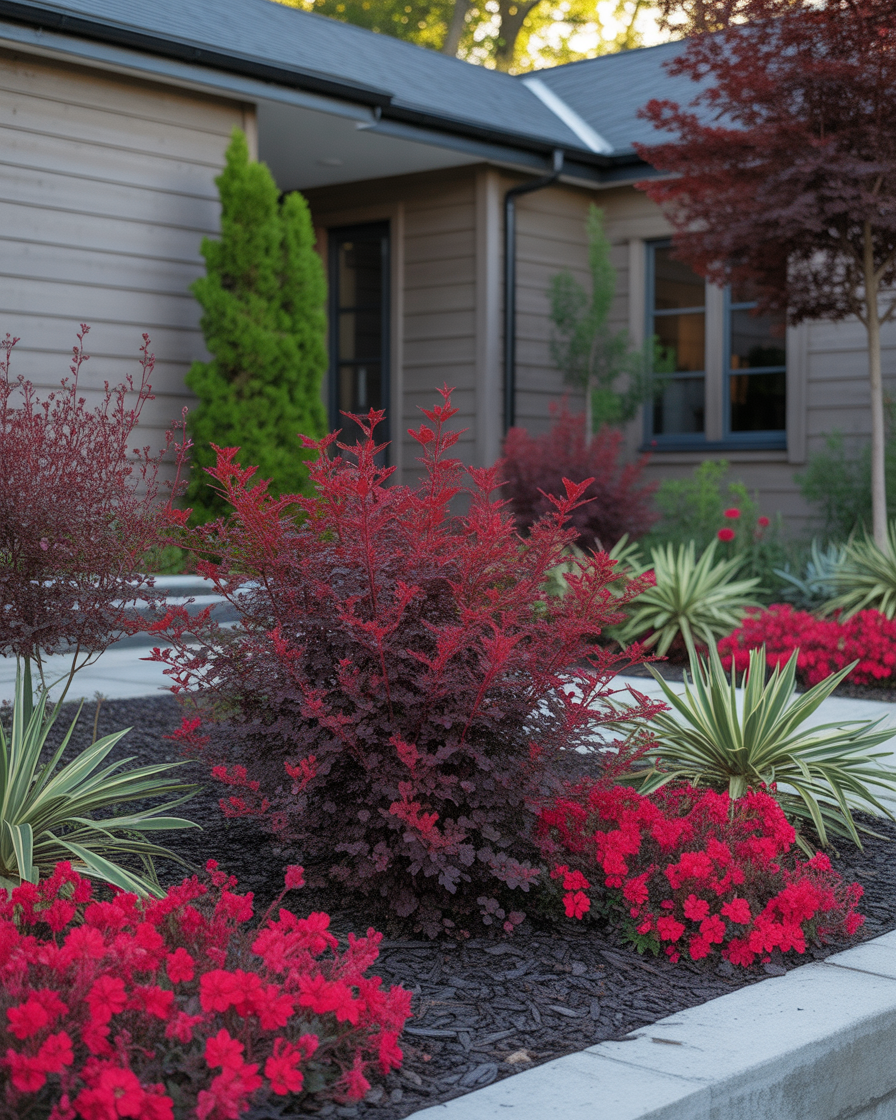 6. Red and Burgundy Front Yard Landscaping for Bold Impact