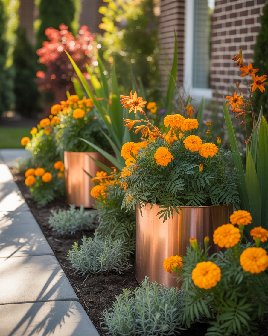 Orange tones bring warmth and energy, which is why I enjoy orange and copper front yard landscaping for seasonal impact. Flowers like marigolds and crocosmia pair well with copper planters or warm-toned stone.