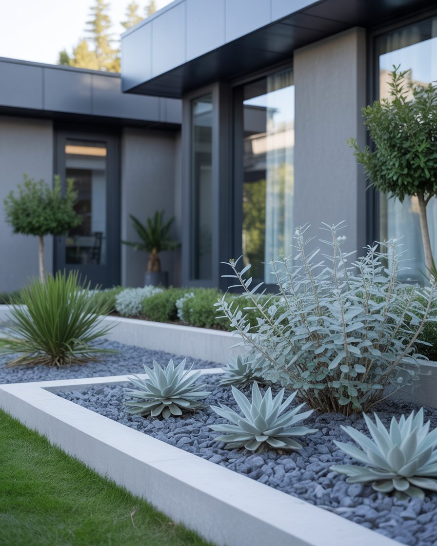A gray and silver front yard feels sleek and contemporary, especially when paired with clean lines. Silver foliage plants, gray gravel, and concrete edging create a cohesive, modern finish.