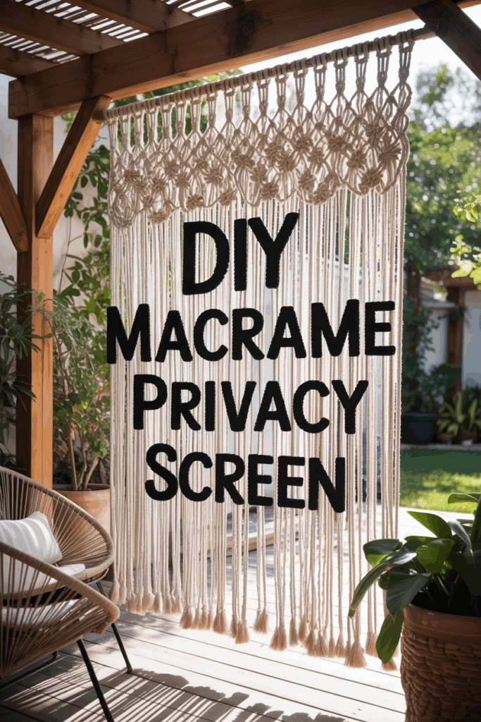 Create a large-scale outdoor macrame panel using thick rope or weather-resistant cord. Hang it from a pergola or deck beam for a boho-chic screen that softens the space while offering partial coverage.