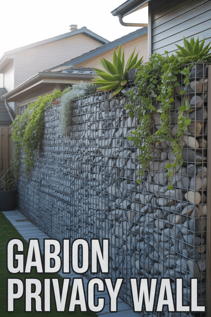 Stack wire gabion cages filled with stones to build a modern privacy wall. Tuck in small trailing plants or succulents between layers to soften the industrial look.