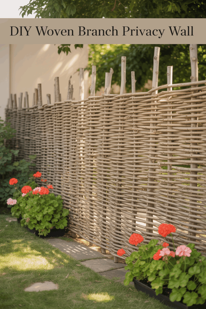Weave trimmed branches or willow whips between vertical wooden posts for a DIY wattle screen. Natural, rustic, and perfect for enclosing a corner seating area or fire pit.