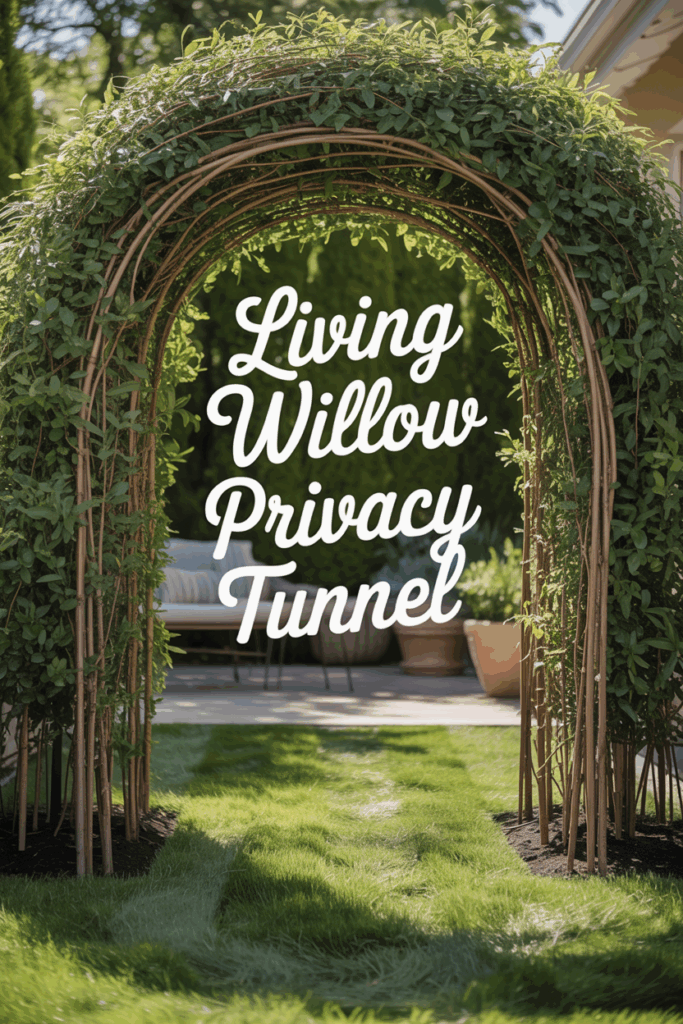 Plant live willow rods and weave them into an arch or tunnel over time. As the rods root and grow, they’ll form a living privacy screen with natural movement and seasonal interest.