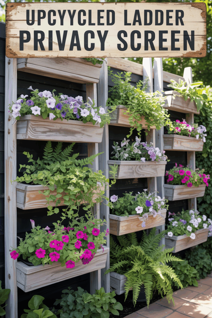 Lean a tall wooden ladder or two against a wall or posts, then hang baskets, plants, or curtains between the rungs. It’s charming and budget-friendly.