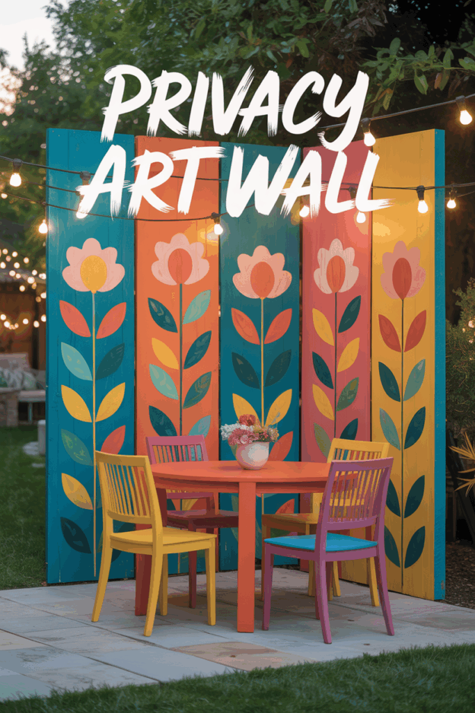 Paint or stencil large exterior-grade panels with bold artwork, then mount them as a privacy wall. A creative way to add color and coverage near dining patios.