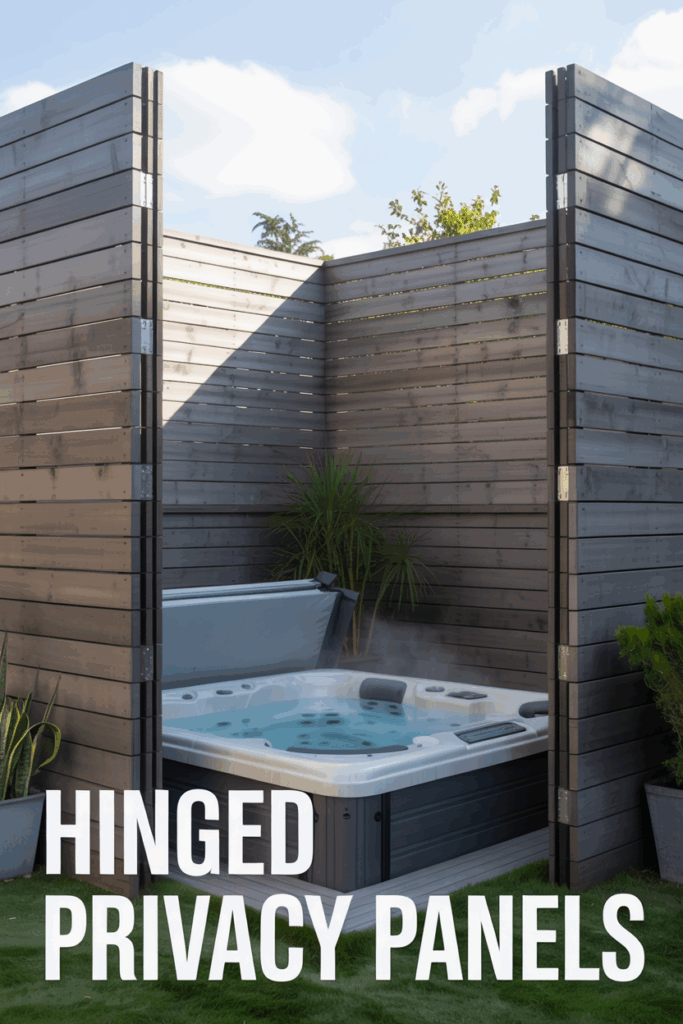 Install hinged wooden or metal panels that can swing open or closed depending on your needs. Perfect for shielding a hot tub, outdoor shower, or dining area.