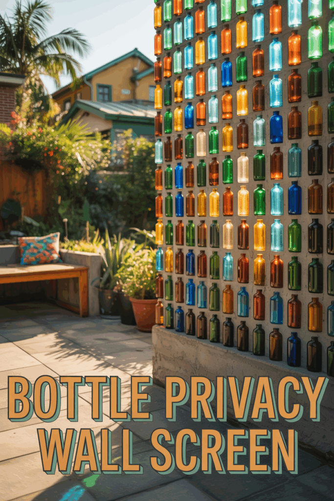 Embed colored glass bottles horizontally into a concrete or wooden wall, allowing light to shine through. Beautiful, bohemian, and perfect for a sunny patio.