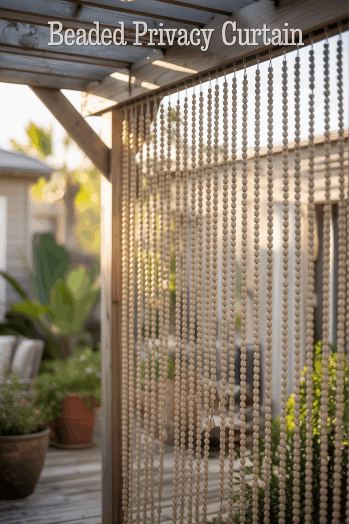 String large wooden beads or resin shapes on fishing line and hang them from a beam or frame. Light filters through while still offering partial coverage and movement.