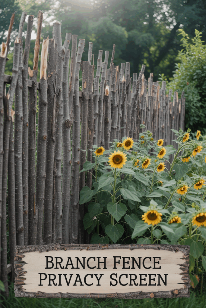 Bundle and stack long branches horizontally between fence posts to create a rustic screen. Ideal for woodland-style gardens or upcycled outdoor areas.