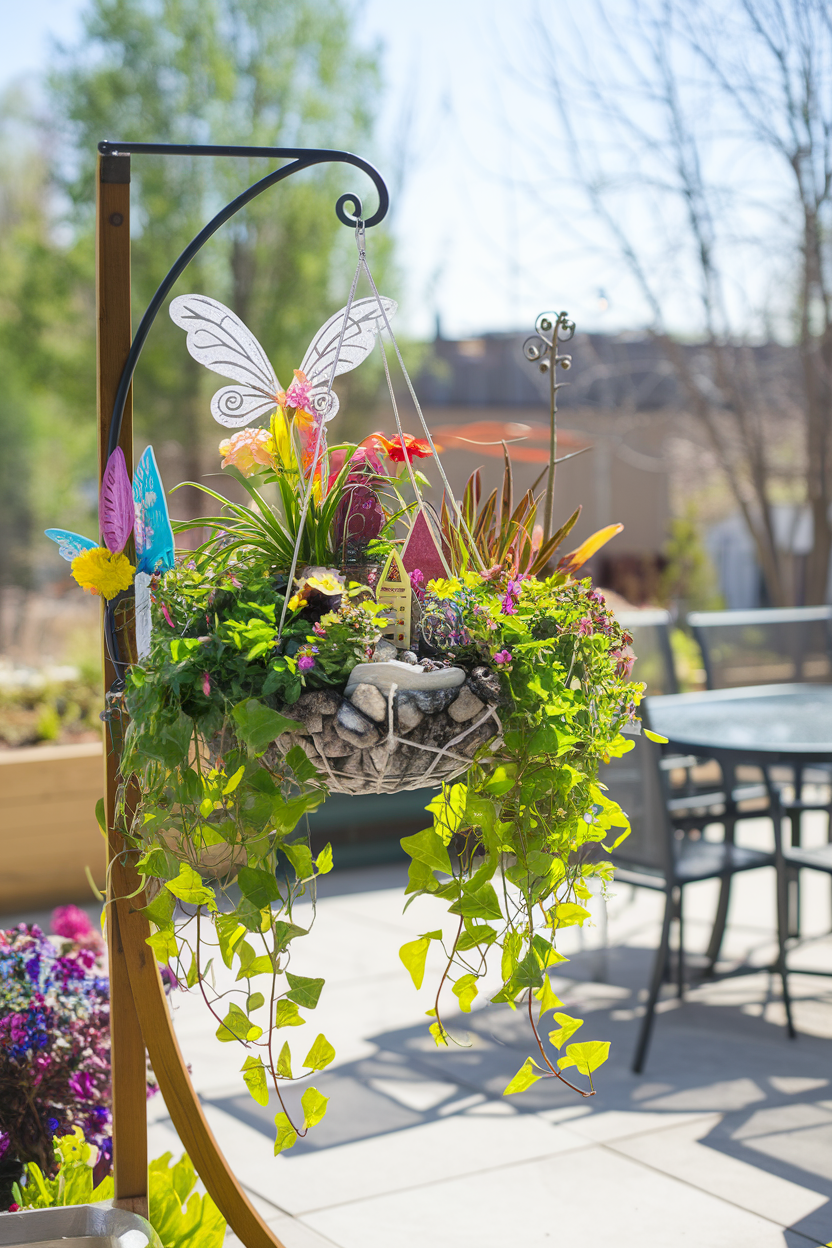 Create a whimsical fairy garden in a hanging basket filled with trailing plants and fairy figurines. It’s a great option for balconies or patios and adds a magical touch to vertical spaces.
