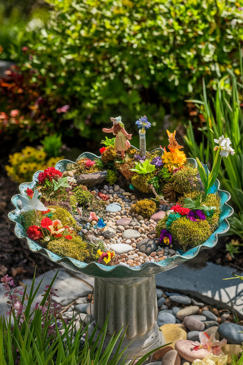 Repurpose an old bird bath as a fairy garden. Fill it with soil, small plants, and tiny decorations. The elevated design makes it a standout feature in any garden.