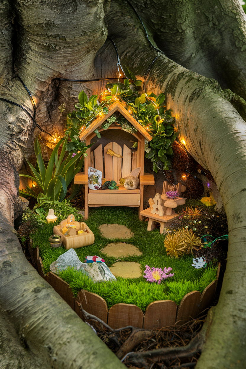 The shade and roots of a tree provide the perfect backdrop for a fairy garden. Add small furniture, fairy lights, and miniature houses to create a cozy, hidden world.