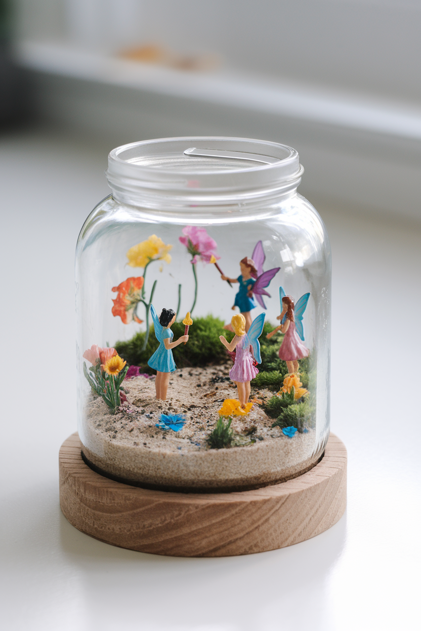 For a compact option, create a mini fairy garden in a jar. Include sand, pebbles, and a small fairy house to craft a tiny world you can display anywhere.