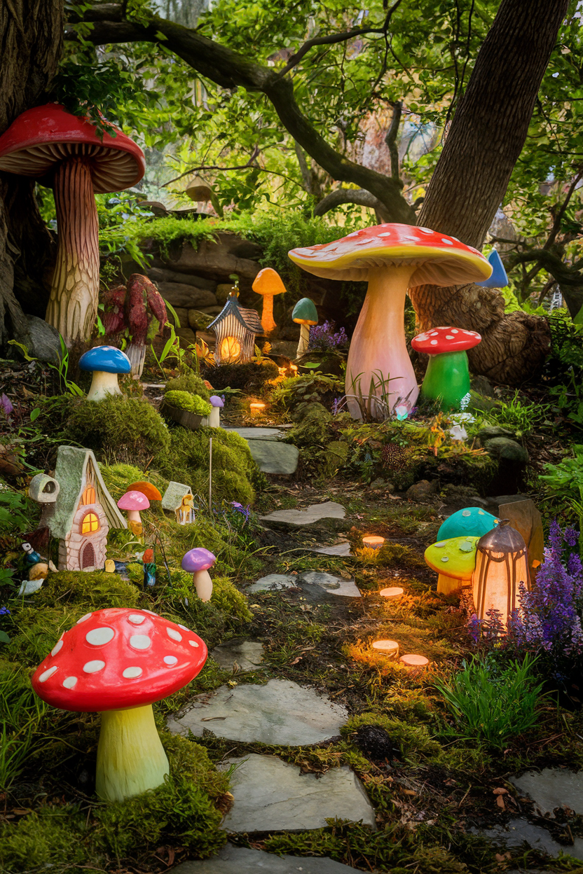 Add colorful mushroom decorations to your fairy garden for a fun and whimsical touch. These iconic elements bring a playful vibe to any setup.