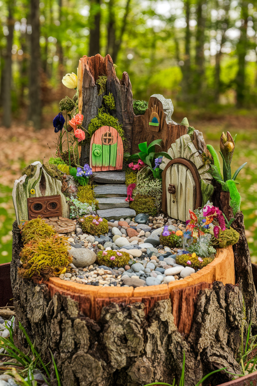 Repurpose a tree stump by turning it into the centerpiece of a fairy garden. Add miniature doors, windows, and pathways to make it look like a tiny home for fairies. Use live moss and plants to blend the design seamlessly into nature.
