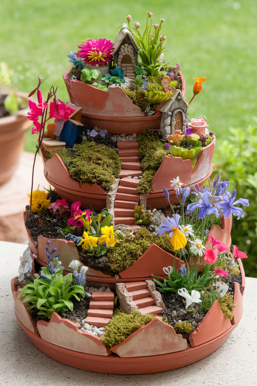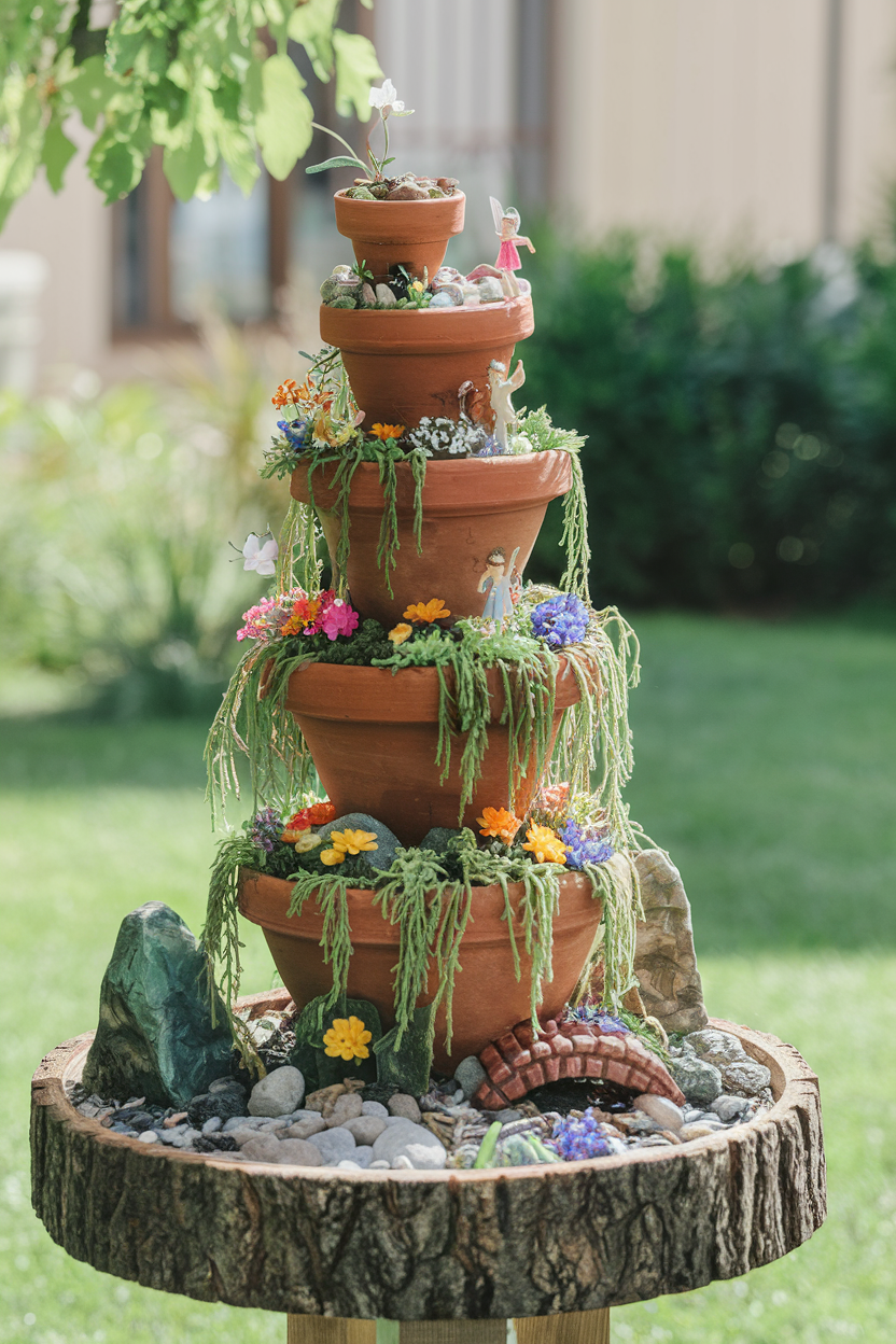 Stack clay pots to create a tiered fairy garden. Decorate each level with miniature plants and fairy furniture for a dynamic, layered design.