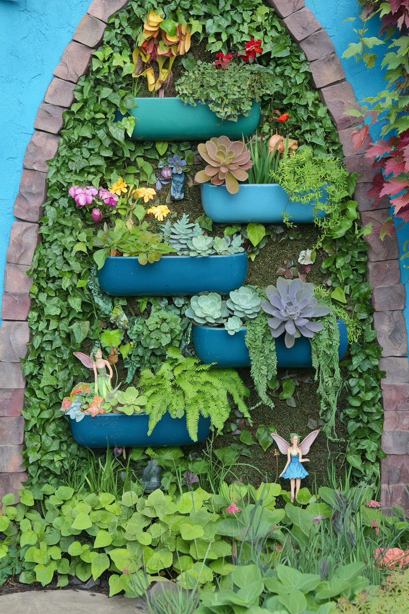Create a vertical fairy garden using wall-mounted planters or a vertical stand. It’s a space-saving option that works well for balconies or patios.