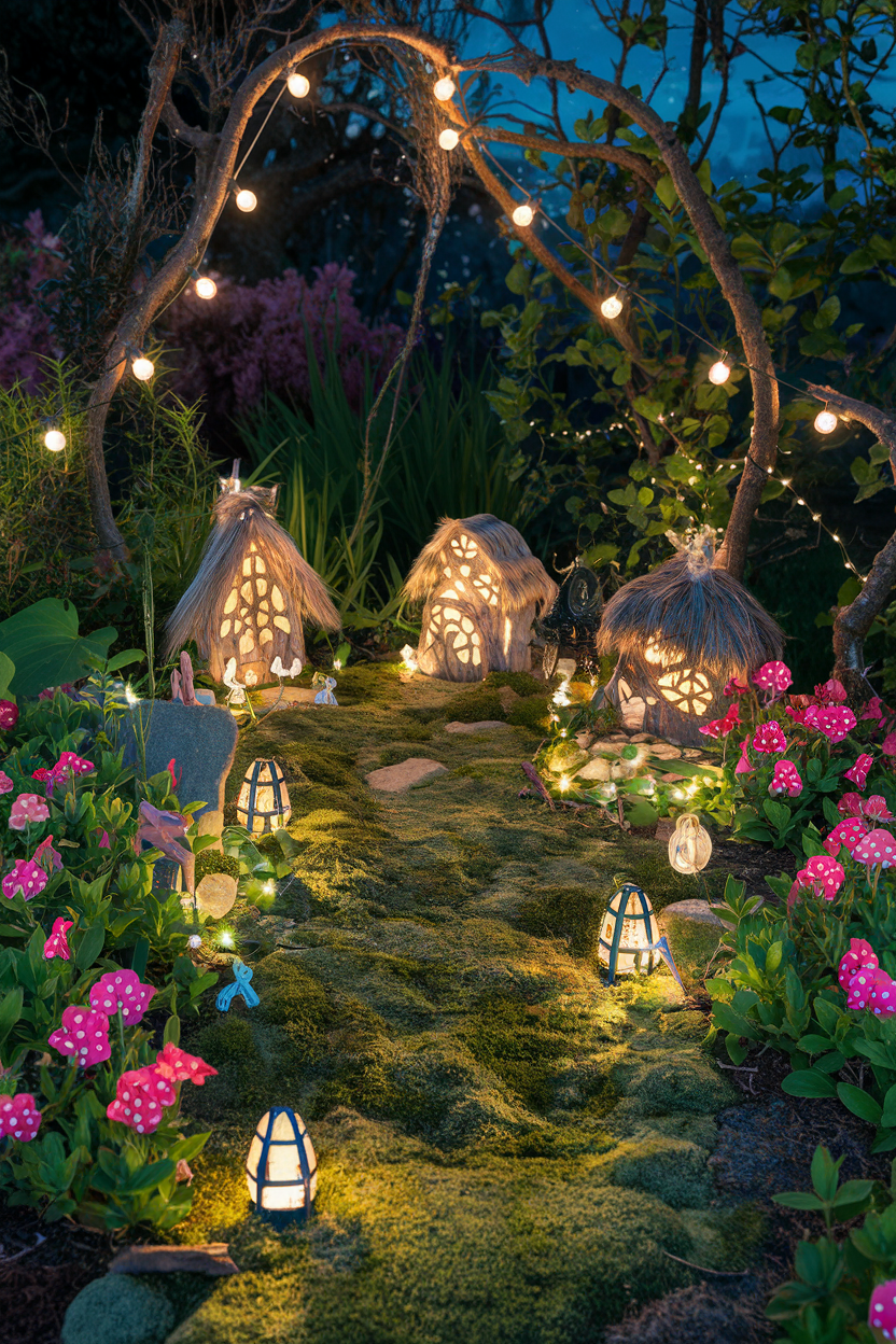 Transform a corner of your yard into a lush, mystical forest filled with moss, miniature trees, and tiny mushrooms. This idea works beautifully with fairy lights woven into the scene to give it a magical glow, creating a woodland sanctuary right at home.