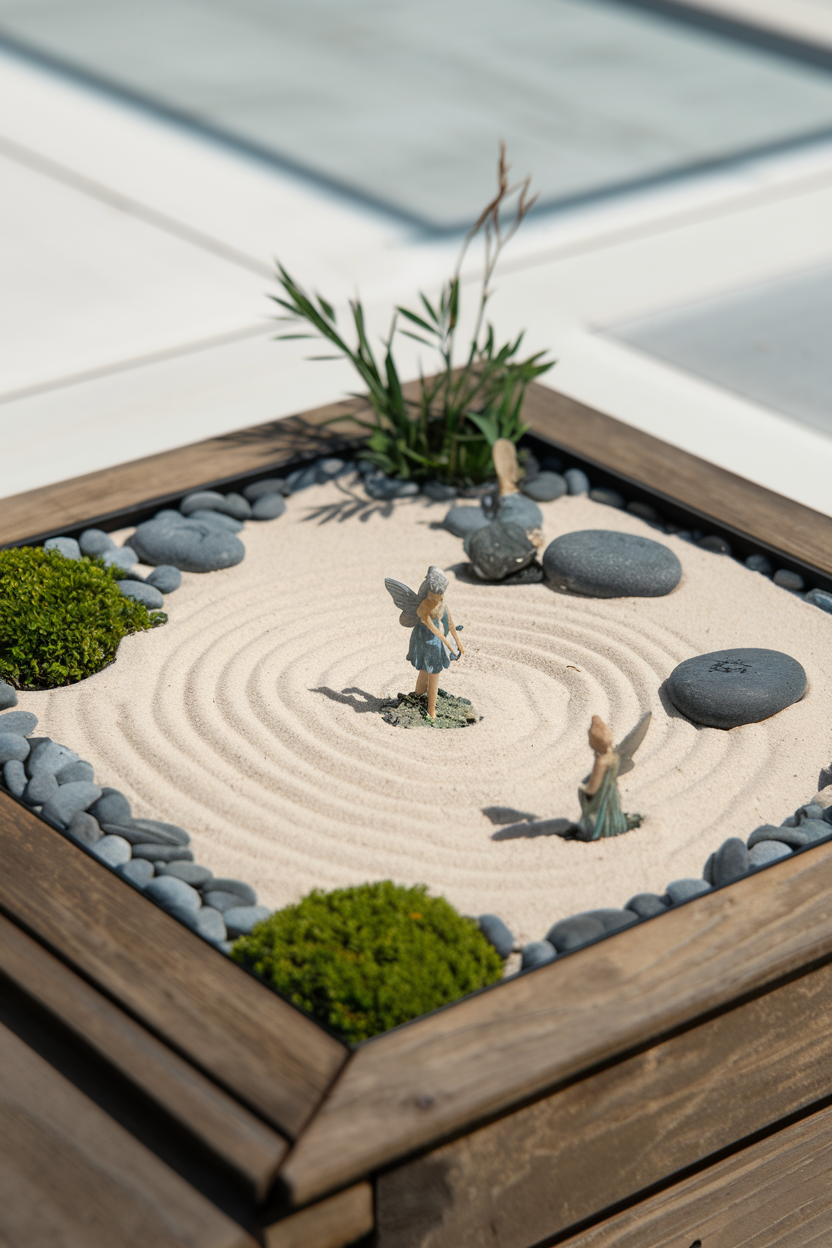 Combine traditional Zen garden elements like sand and stones with fairy decorations. The result is a peaceful, meditative miniature world.