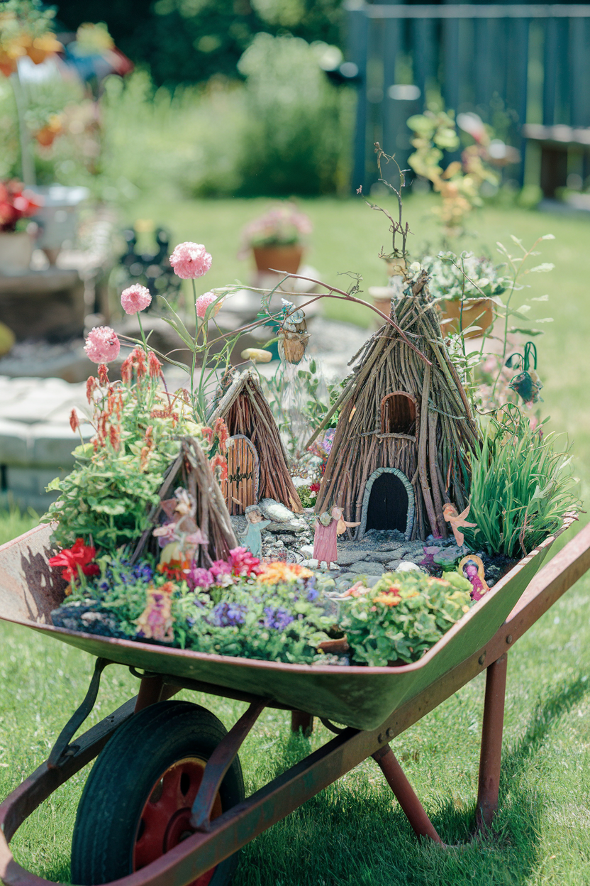 Upcycle an old wheelbarrow into a fairy garden. Add plants, decorations, and fairy houses to turn it into a movable enchanted display.