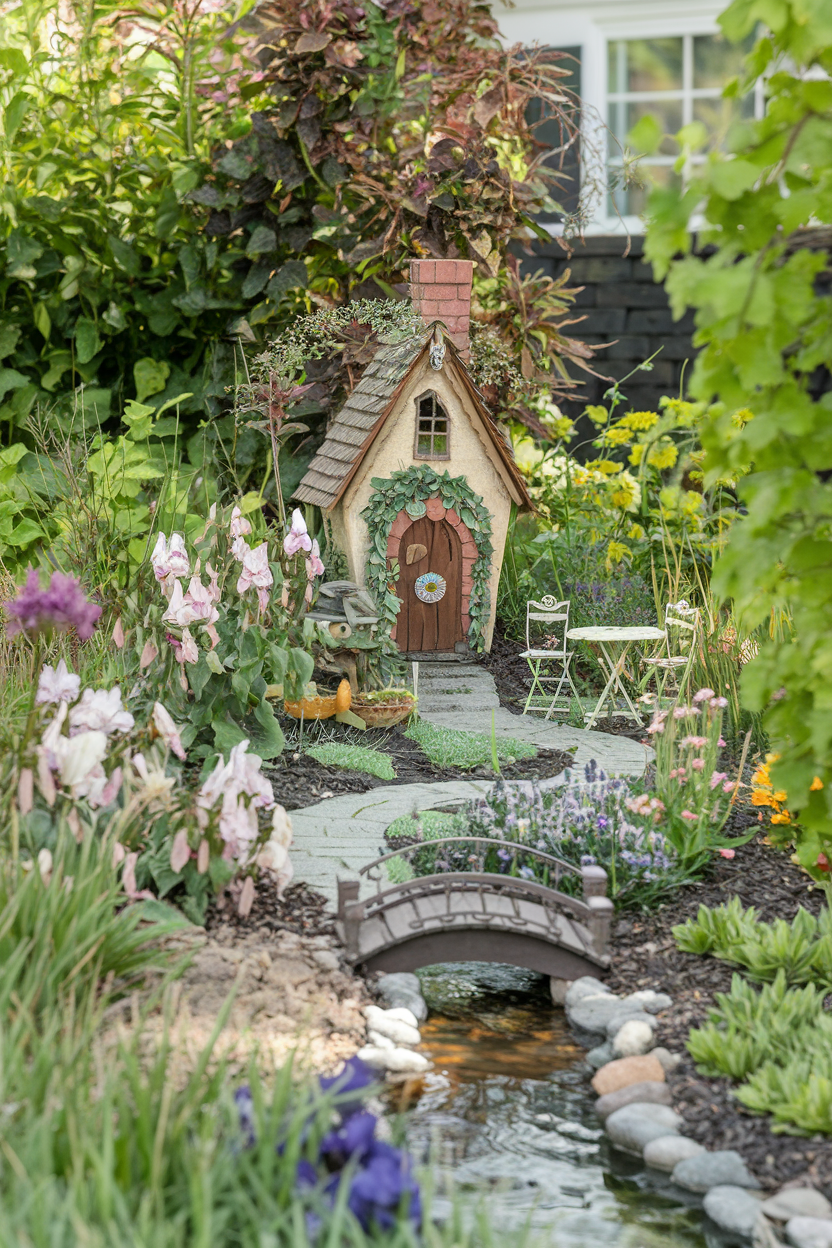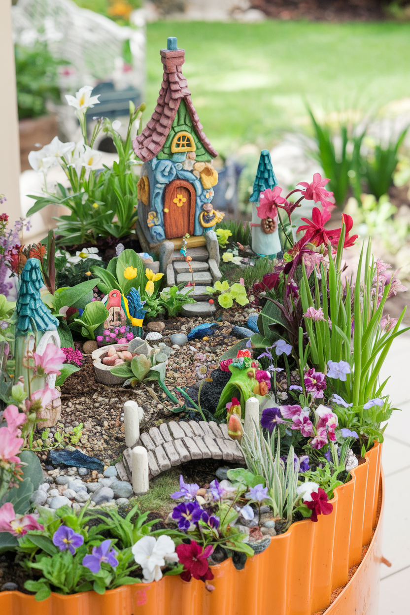 A raised flower bed is an excellent setting for a fairy garden. Arrange miniature houses, pathways, and bridges among vibrant flowers to create a captivating scene. This design works well in both small and large yards.