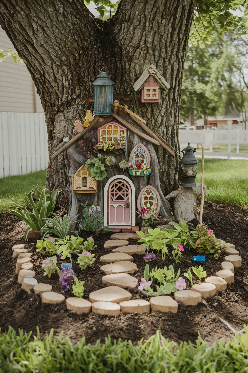 Decorate the base of a tree with fairy elements like doors, windows, and lanterns. This setup gives the impression of a fairy family living inside the tree, blending fantasy with natural surroundings.