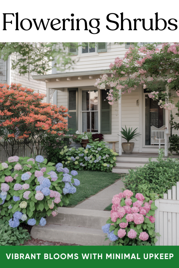 Add color and structure with low-maintenance flowering shrubs like hydrangeas, spireas, or azaleas. They bloom beautifully with minimal care.