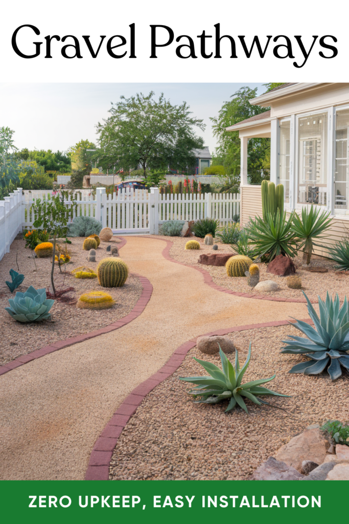 Create clear, low-upkeep walkways using gravel or decomposed granite. They’re easy to install, cost-effective, and look great with any style of home.