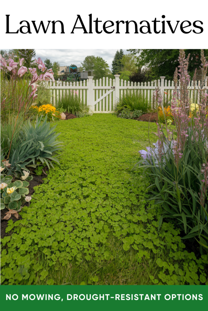 Consider clover or moss as an alternative to traditional turf. Both are drought-resistant and don’t need frequent mowing.