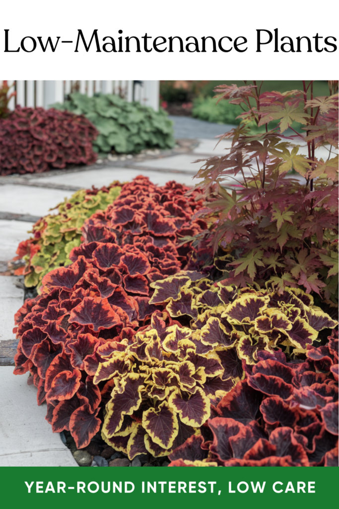 Choose foliage-forward plants like coral bells or heuchera for lasting color without constant deadheading or fertilizing.