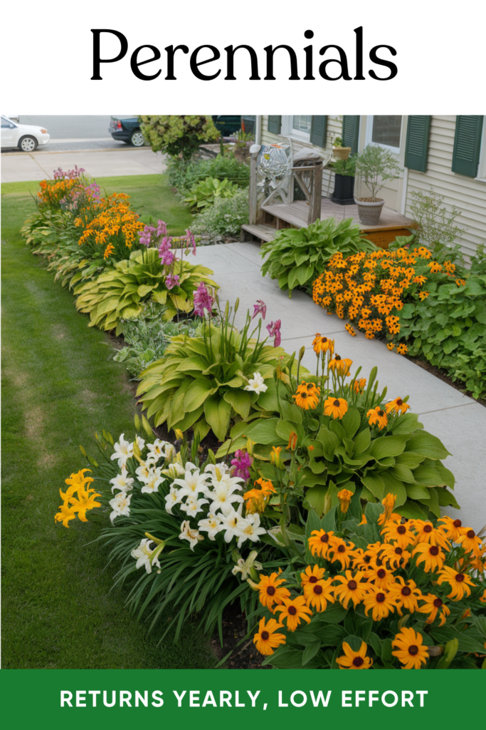 Plant hardy perennials like black-eyed Susans, hostas, or daylilies. These come back year after year, giving you color without replanting.