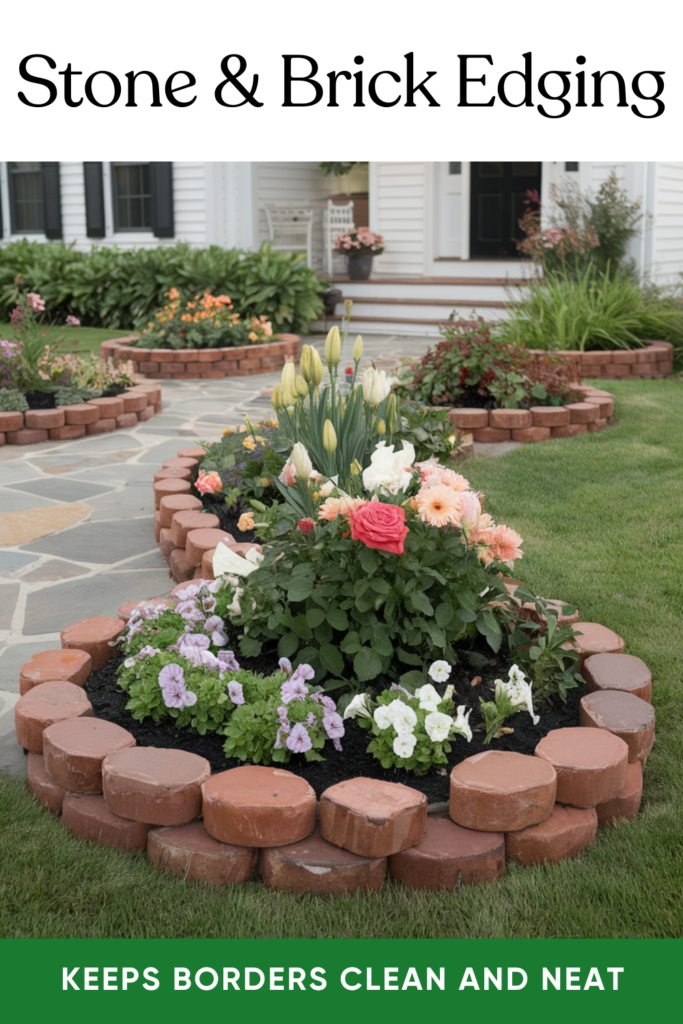 Define your flower beds with stone or brick borders. It’s a simple way to stop weeds from creeping in and give your landscaping a polished finish.