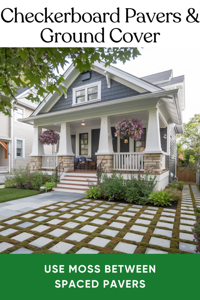 Lay pavers in a checkerboard pattern and plant creeping thyme or moss in between. It’s a simple, eye-catching design that’s both practical and easy to maintain.