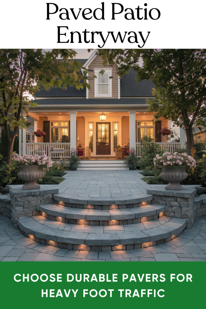 Extend your entry with a fully paved patio. Materials like brick, flagstone, or concrete pavers are durable and easy to maintain. Add comfy outdoor seating, potted plants, and some string lights for a welcoming vibe.